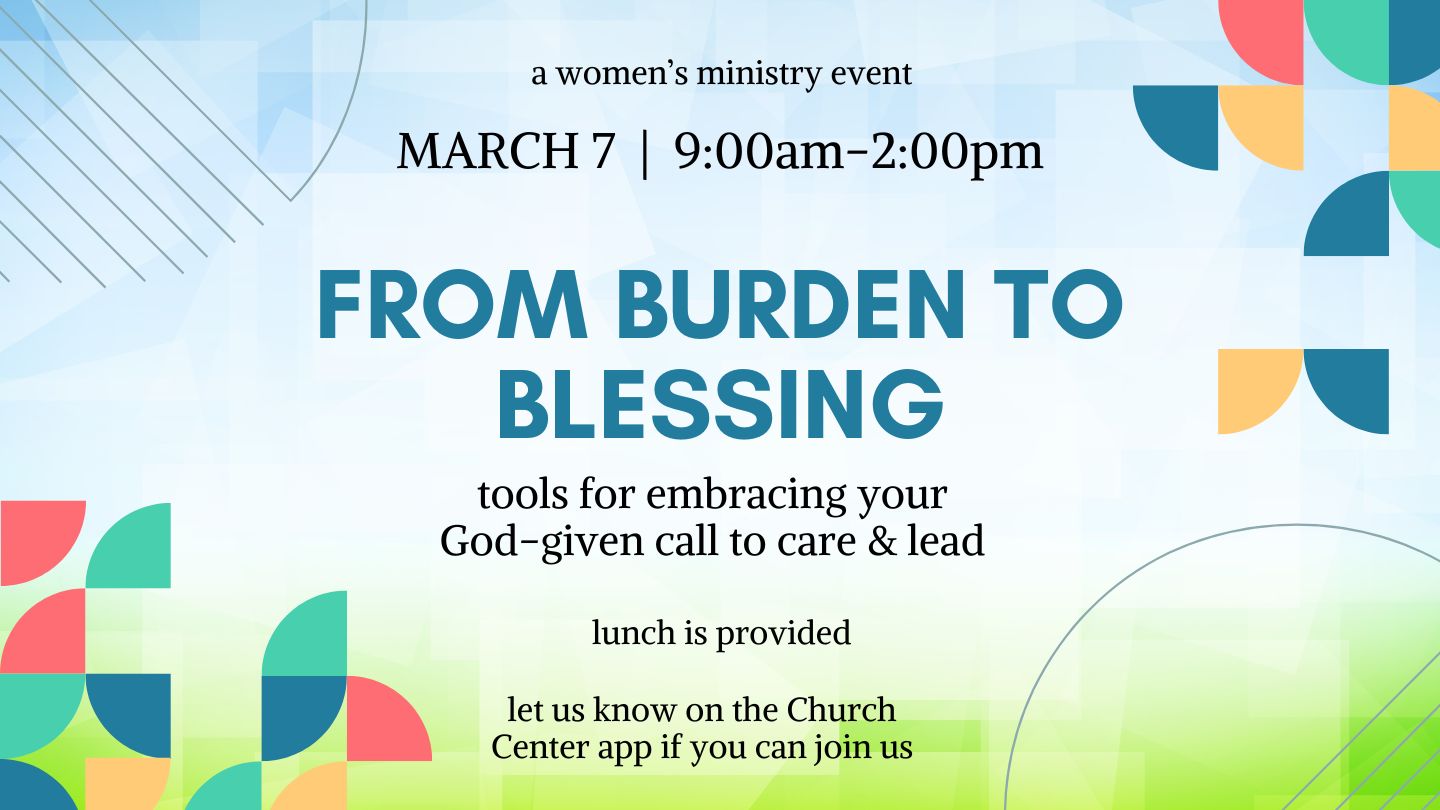 From Burden to Blessing: Tools for Embracing Your God-Given Call to Care and and Lead – Whether in family, career, or ministry service, we are often called to care for and lead others. During this mini-retreat, learn how God transforms these burdens into profound blessings, and gain Biblical tools for your unique work. Lunch will be provided, and breakout sessions will take us deeper into specific roles. Please let us know if you’re able to join us!