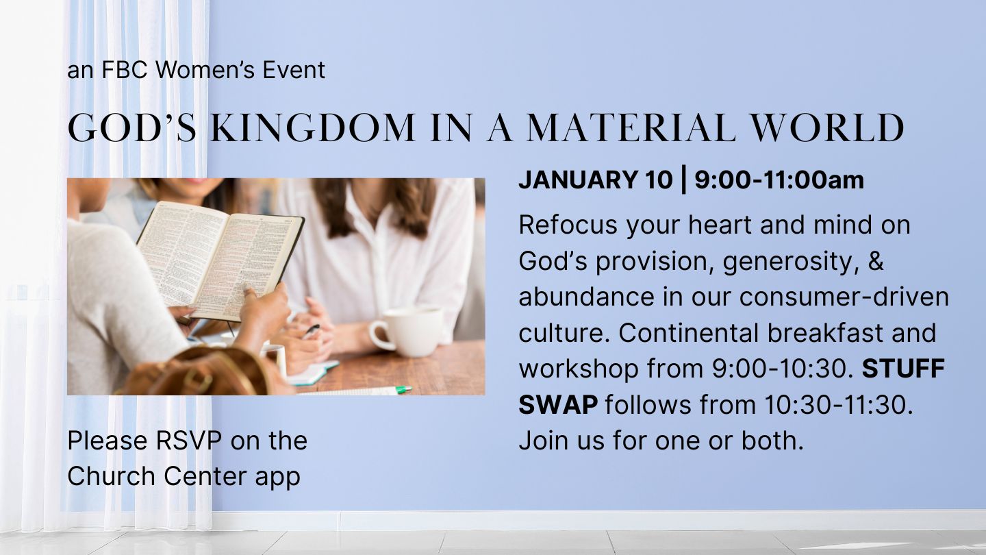 Refocus your heart and mind on God’s provision, generosity, and abundance in our consumer-driven culture. Continental breakfast is provided before the workshop. Stuff Swap follows 10:30-11:30am. Join us for one or both. Share your items and find some new treasures! Sorry, there’s no early drop-off for your stuff, and everything needs to be taken home at the end of the day. Just bring your items, swap away, and grab anything that catches your eye. This is for FBC women only. For planning purposes, please let us know if you’re able to join us.