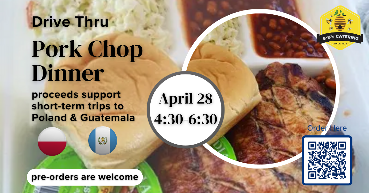 Individuals participating in the Poland & Guatemala mission trips this summer invite you to enjoy a highly sought after 5-Bs pork chop dinner. The cost is $18.00 for each meal. Any profit directly supports both of these summer trips. Come enjoy a great meal and help out our teams spreading the gospel of Christ around the world! Choose from 3 options: (each option includes applesauce, baked beans, cole slaw, dinner roll & butter)