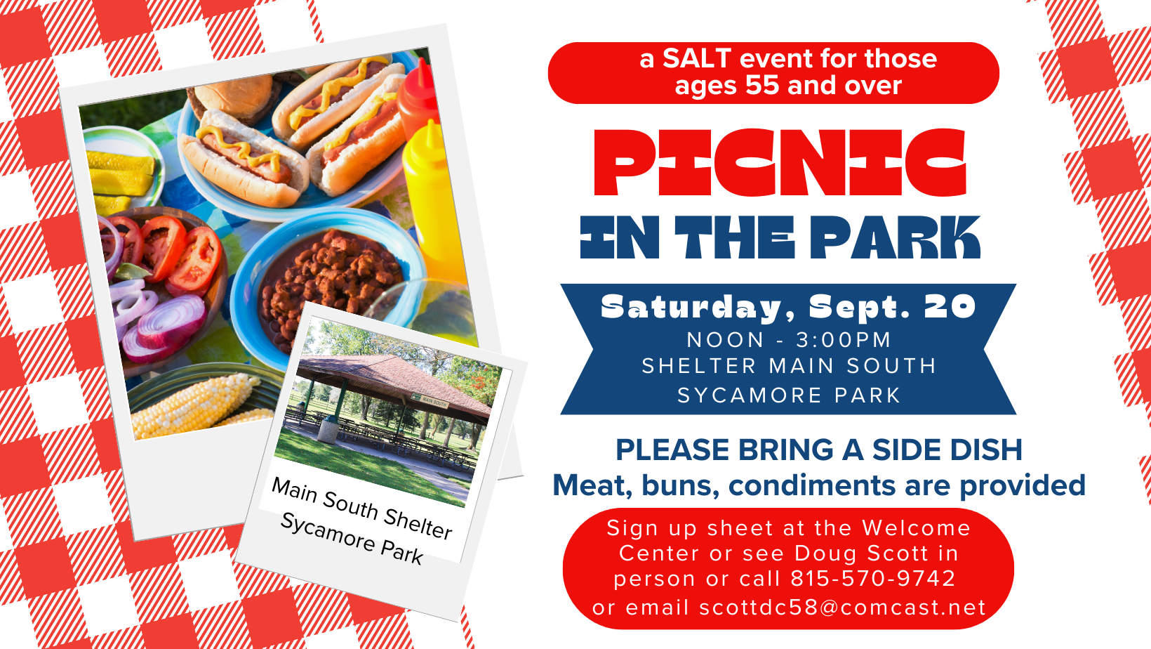 SALT (senior adults living triumphantly), is hosting a Picnic in the Park for those ages 55 and over on Saturday, September 20 - noon-3:00pm - in the Main South shelter at Sycamore Park. Meat, buns, and condiments are provided. Please bring a side dish. Sign up at the Welcome Center and let us know what […]